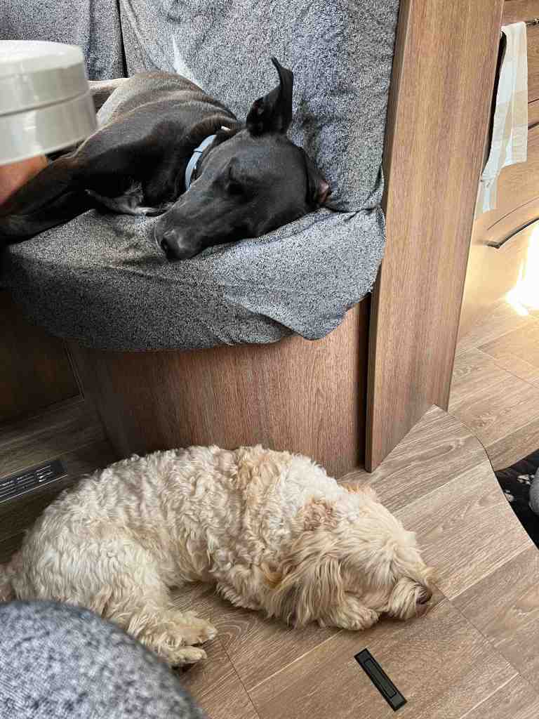 Hundarna som i fredags inte var jättegoa kompisar 🙄 – Binkan var verkligen en otrevlig värd!!!🤨 Men i går orkade han helt enkelt inte mopsa sig, så de slocknade båda två 🤣