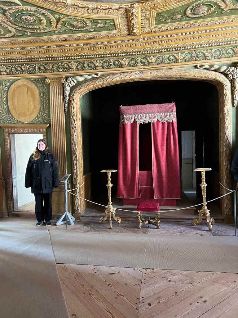 Om jag inte missminner mig så var detta en kopia av drottning Kristinas säng. Anledningen till att den är så kort är att de satt upp när de sov, eftersom man trodde att de fyra kroppsvätskorna i kroppen inte skulle blanda sig 🙈, för man trodde att det var det som gjorde att man blev sjuk! 😯