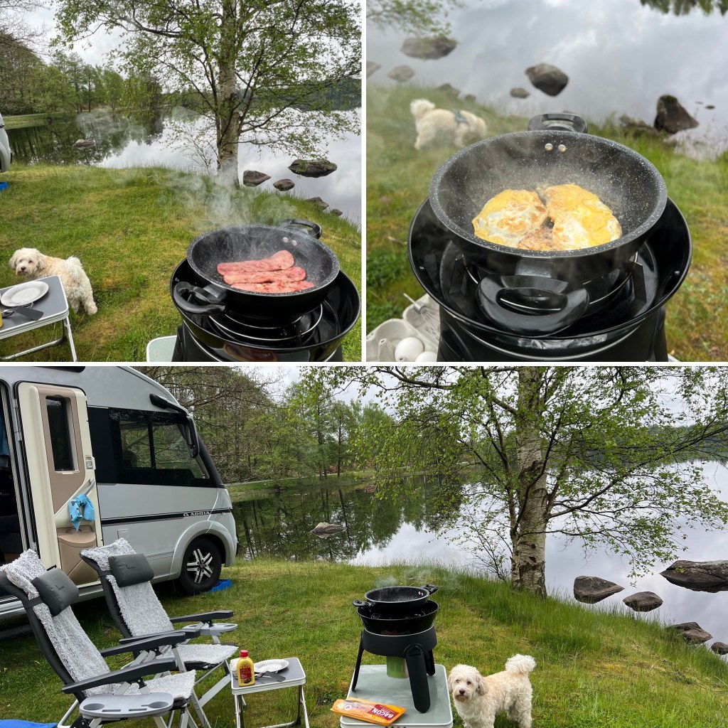 Frukosten i söndags intogs ute – finns det något bättre?? 🤩 Nej! Helt vindstilla och tyst och stilla, ja förutom tuppen på granngården. Han pratade med en annan tupp tvärs över sjön 🤣🐔