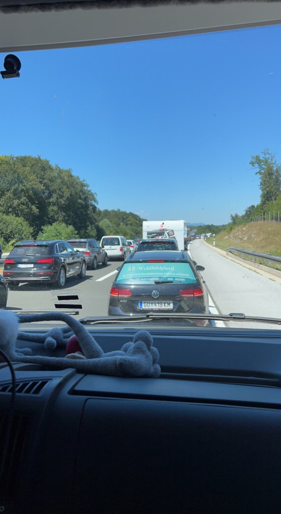 Nu var vi klara med Kroatien. Hjärnan var överkokt i värmen och vi var trötta på att det var fullt på varenda camping! Vi styrde kossan mot Österrike! Meeeeen kom vi så långt?? Nä! Olycka på motorvägen och vi blev stående i över två timmar – inte jättekul i 33 graders värme!