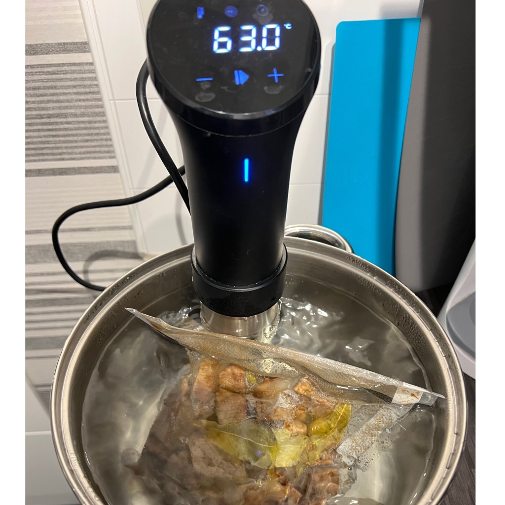 I alla fall, jag ”svävade ut” i onsdags kväll och stekte nötgrytbitarna i redigt smör och lök, sen ner i påse, vakumpackade och ner i badet med Sous videstaven ställd på 63 grader, för att ligga där och gotta till sig i 24 timmar.