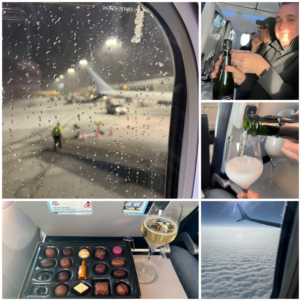 Vi lämnade ett snöigt Göteborg och väl uppe ovan molen kom solen och med den en överraskning för Micke. Man kunde nämligen beställa uppvaktning på planet – champagne och choklad 🥰, och det hade jag i hemlighet gjort. Men herre min skapare vad trångt det var i planet!!! Micke med sina långa ben fick knappt plats – klaustrofobisk känsla delux kan man säga!! 😵💫