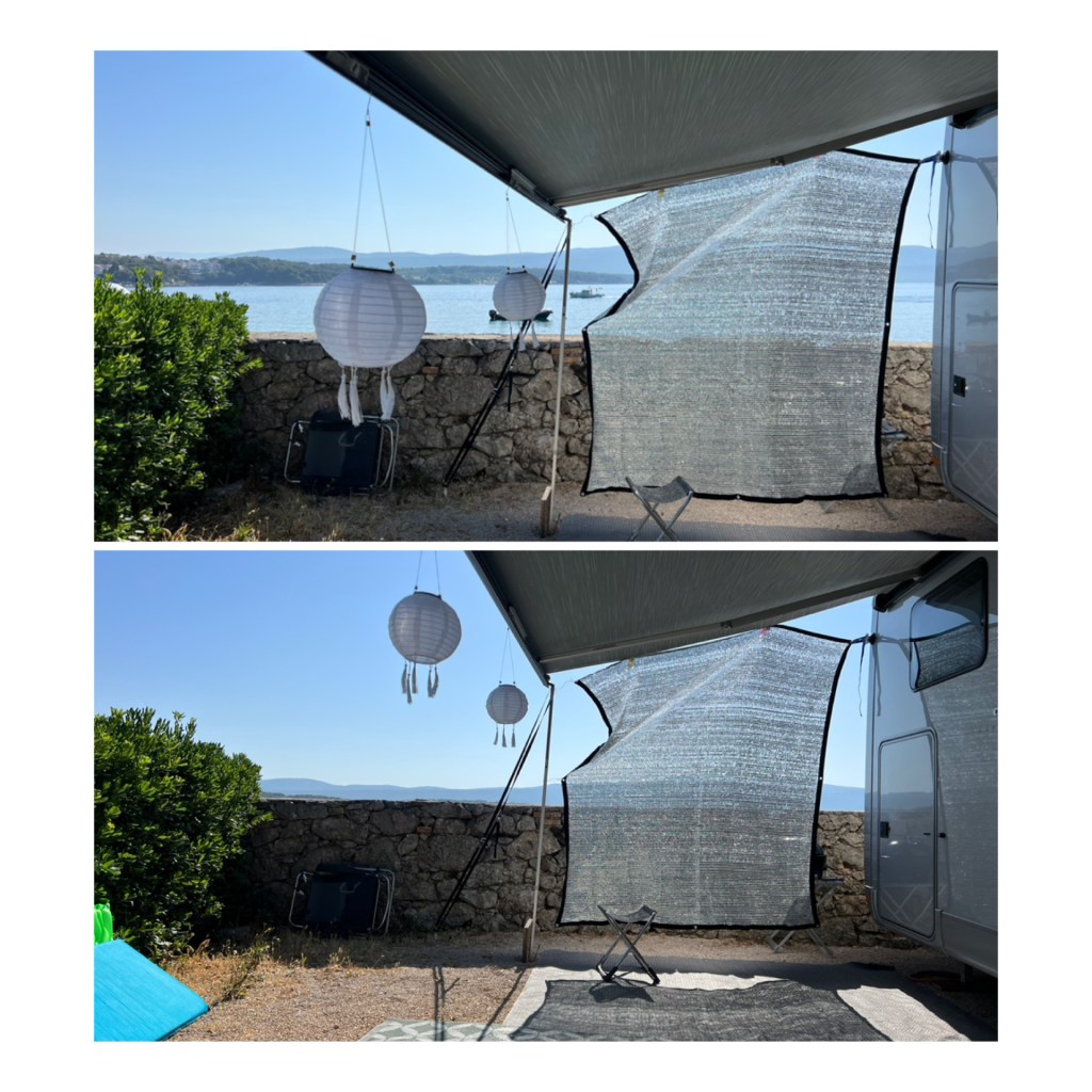 Jag tipsade faktiskt campingen om att ta ner en eller två rader av muren när vi fick deras mail om vad vi tyckte om campingen 😜, så kanske, kanske, om man kommer dit en gång framöver så finns det möjlighet att man faktiskt ser havet – även när man sitter ner 🤣. I så fall vet ni vem ni ska tacka!!! 😄