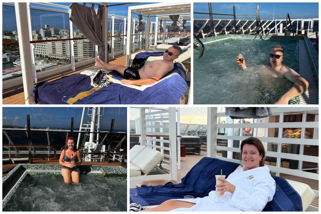 Då befann sig alla på båten – 5 877 passagerare + 1648 besättningsmän om det nu var fullbokat?! Det kan bli lite mycket folk på vissa ställen, men inte där vi var, där var det i stället huggsexa på sängarna med soltak – alltid är det nått 🤣.