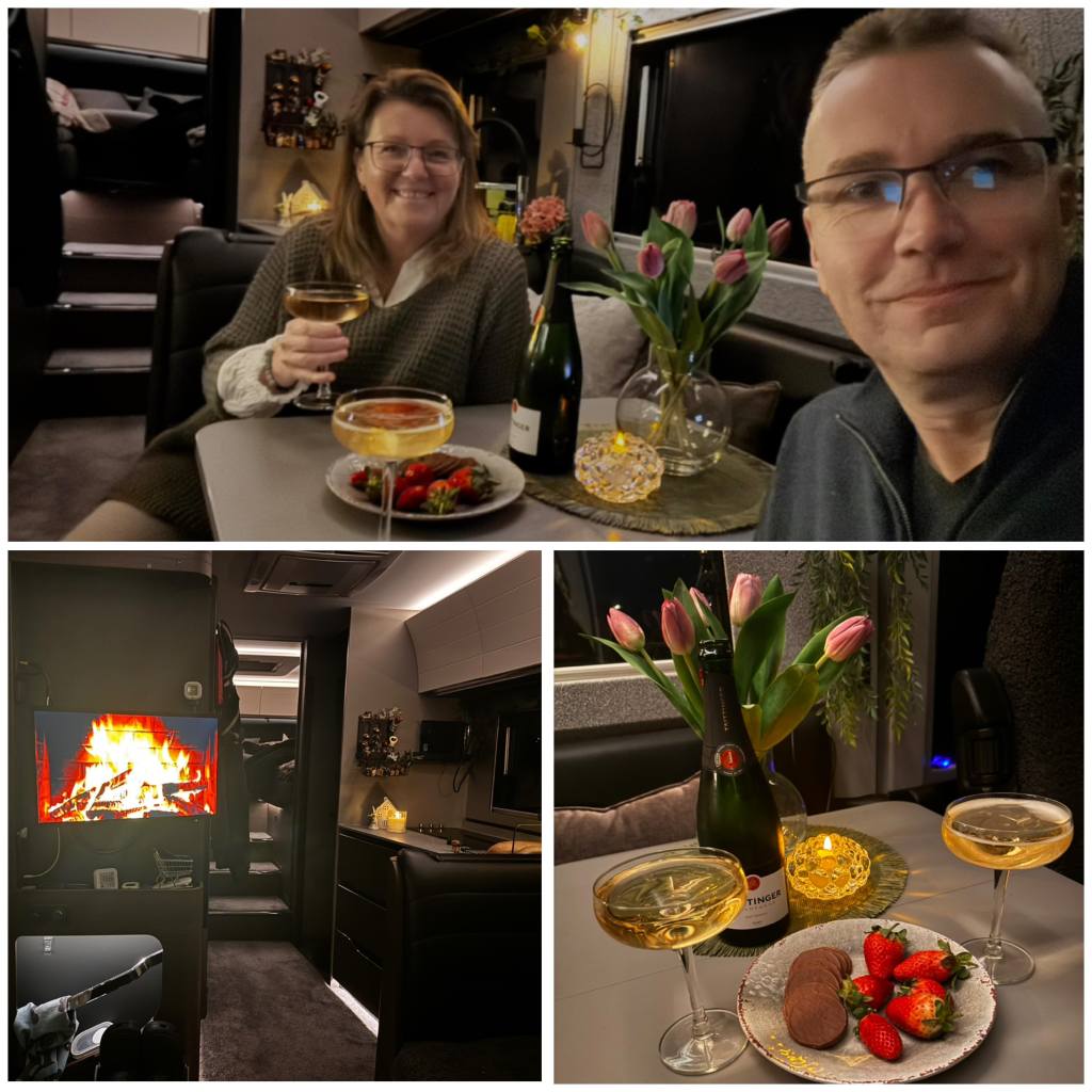 Micke gick en runda i mörkret med Binkan medan jag ”tände brasan” 🤣, plockade fram bubbel, choklad och jordgubbar – här skulle husbilsåret 2024 skålas in – nyår HA! vad e de mot det här! 🤪