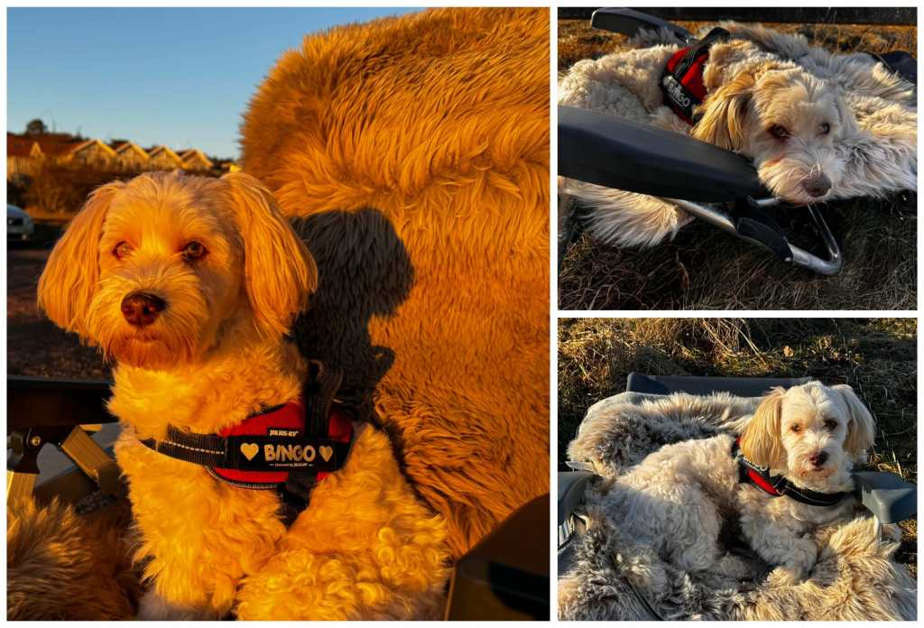 Bingo fick i alla hjärtansdag present en fäll att ha på ”hans” stol (min solstol), nu var det dags att testa den. Jo då den dög, men så fort Micke lämnade sin stol så intog han den igen 🤣.