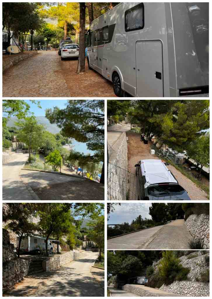 Vår plats (nr 21) var rätt lätt att komma till, eftersom vi står så högt upp (typ 30 meter), har skugga av höga tallar hela dagen och havsutsikt eftersom campingen är i etage.