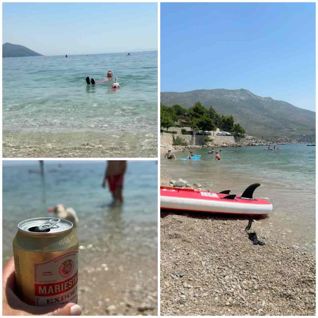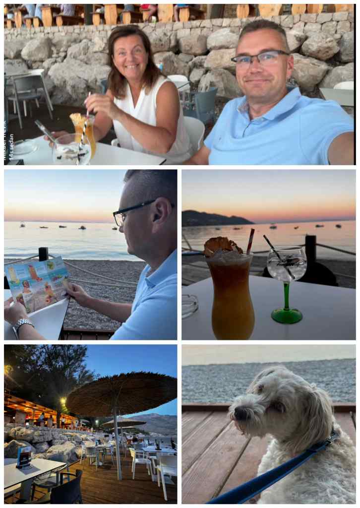 Sen blev det bad, ja det är nog det vi gör mest faktiskt – badar! Binkan har kommit igång med sin simning och tycker det är superkul när vi kastar ut ringen i vattnet. Han viftar på svansen när han simmar tillbaka med den 🤣 (kan i o f s vara för att hålla balansen… men ändå – han tycker det är skitkul!) På ungefär en tredjedel av stranden får man ha hund på vilket vi tycker är jättebra! Däremot finns det ju aldrig några solstolar eller parasoll att hyra på just den sidan…. 😔