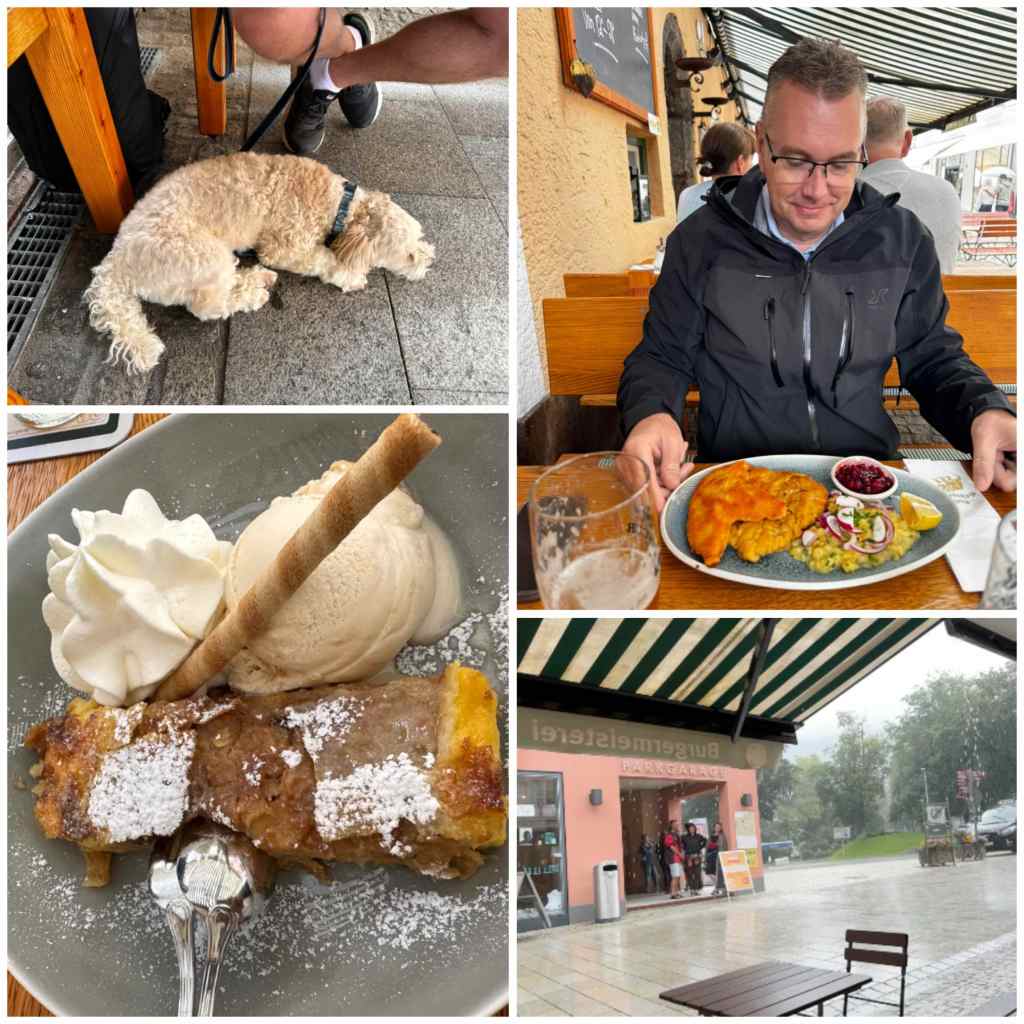 Jag hade i min väderapp sett att det skulle börja regna runt kl 12 och mycket riktigt började de första dropparna falla 12.00, men eftersom det var samtidigt som Mickes mat och sovklocka ringde sladdade vi in på en restaurang, där schnitzel no 6 intogs = den absolut bästa på hela resan 😍!!! Jo, jag åt en jag med – riktigt god!!!
