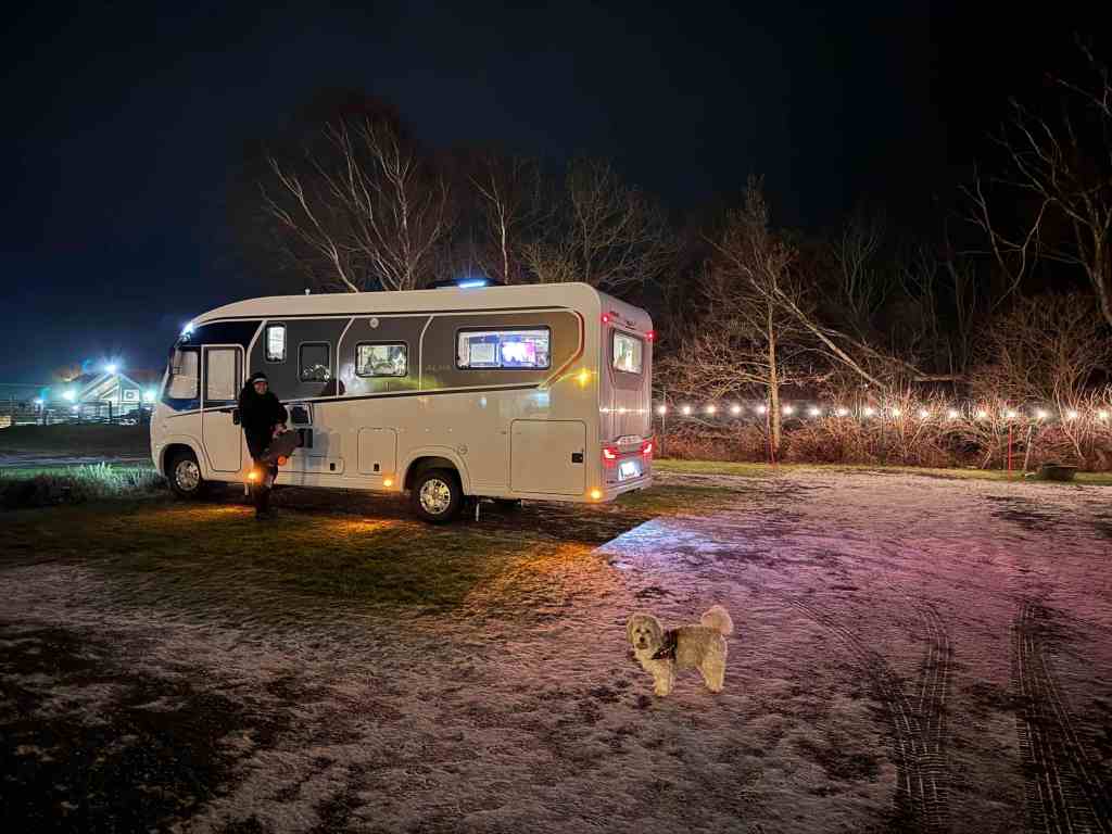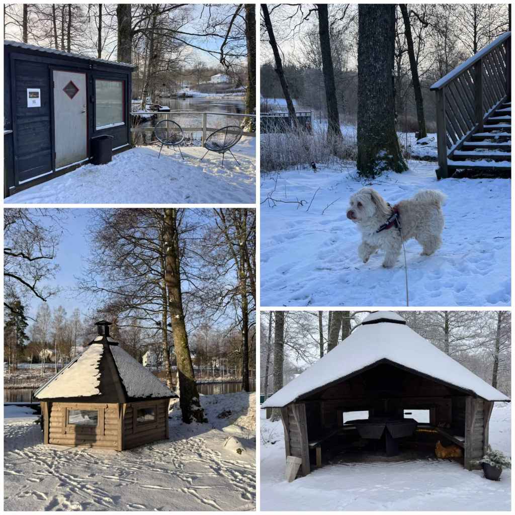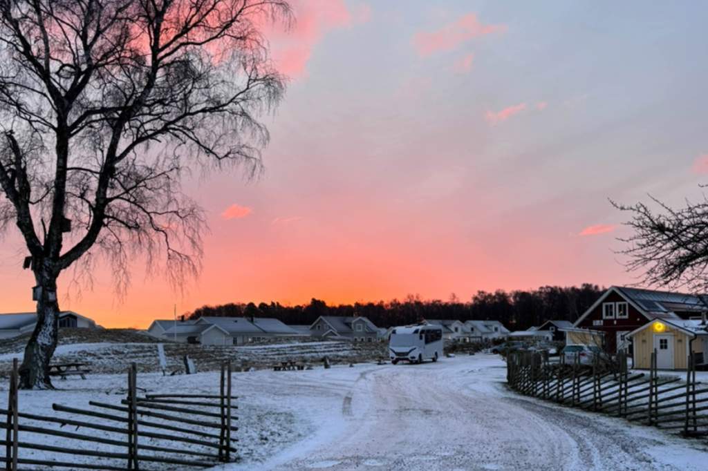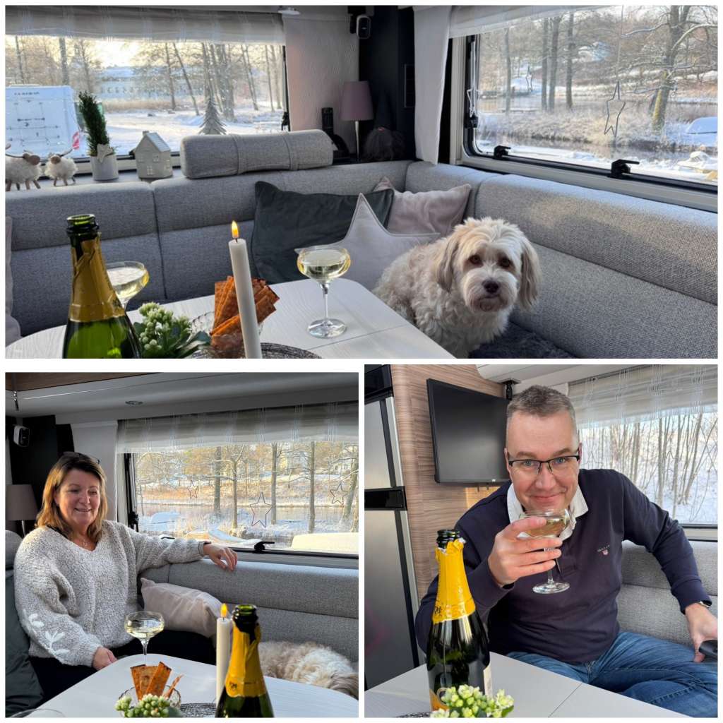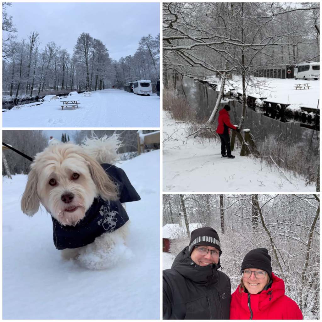 Vi kom iväg runt klockan fem på fredag kvällen – det blåste och snöade 💨 ❄️, så att köra hela vägen fram var vi inte sugna på. Vi svängde av redan vid Tvååker, och drog handbromsen på en trevlig liten ställplats, nämligen SmeaKalles. När vi nu hamnade där passade jag på att boka bord på Sonjas Veranda (detta hade verkligen inte behövts såg vi när vi kom dit 🤣). Det stället har också legat på min ”to-go-to-lista” sedan länge, och jag tyckte det passade bra som överraskning till Micke nu när han fyllde år 🥰