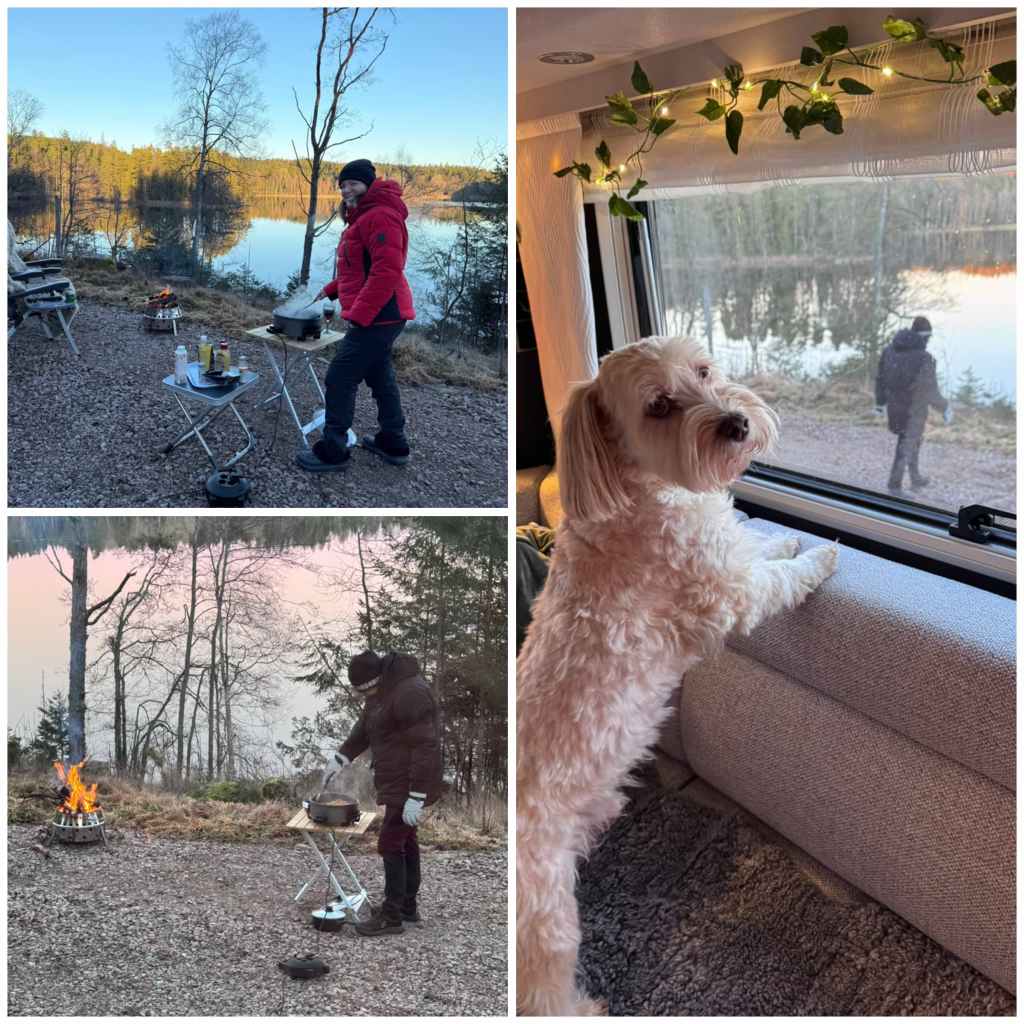 Vi ville inte gå in och laga mat så Micke drog fram förlängningskabeln och jag fick magisk utsikt till matlagningen ❤️.