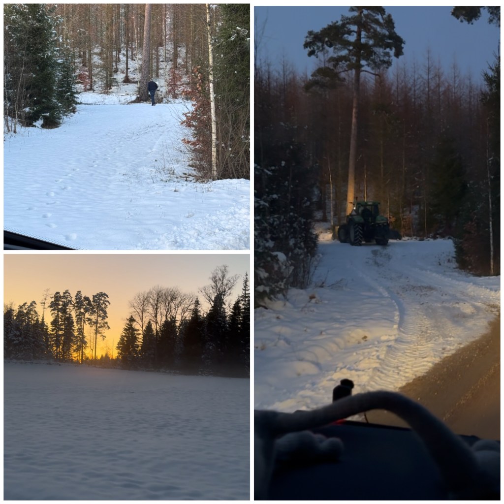 När vi närmade oss platsen såg vi att det var ca 15 cm djup snö in på vägen som ledde till platsen – där vågade vi definitivt inte köra in! Vi ringde de som hade platsen som verkligen var supertrevliga, de hade missat mailet som de fått om bokningen tidigare på dagen. Fem minuter efter vi ringt dem, kom de ut med traktorn och plogade vägen framför oss 🤩 vilken service 🥰!!